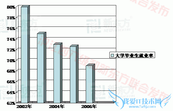 The employment rate of university graduates is declining nowadays. Reading this chart, we can find that the employment rate ofuniversity graduates has declined gradually. It declined from 80 percent in 2002 to nearly 75 percent in 2004, and finally, the rate dropped to no more than 70 percent in 2006.