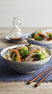 4瓣蒜,切碎 2汤匙新鲜的姜,切碎 2汤匙酱油 2汤匙白醋 半茶匙辣椒粉 450克沙朗牛排,切成5毫米薄片 4汤匙葡萄籽油 半个中号红皮洋葱 半个红椒,去籽并切片 1千克西兰花 75毫升牛肉汤或鸡汤 2汤匙芝麻籽 350克煮过的藜麦