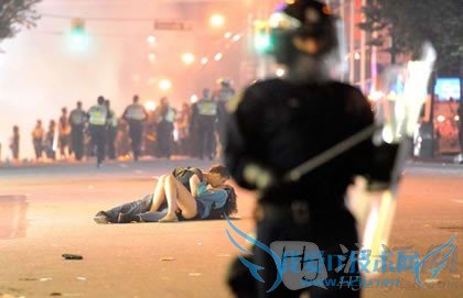 Following the riots in Vancouver, one photo was shared more than the rest among users of Twitter and other social media. It shows a young couple tangled in each other's arms on the street, kissing, while the police and mayhem-makers clash all around them.之前温哥华冰球队在决赛中失利,引起了球迷骚乱,暴徒放火抢劫,警察不得不使用催泪瓦斯。不过有张现场照片引起了更大的关注,照片上一对情侣倒在地上,不是受伤了,而是在拥吻。
