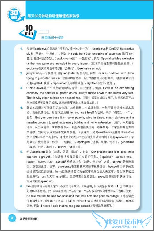 •自由输出十分钟:每篇访谈之后都有关键知识点的提炼,编者以数十年的英语学习经历、海外见闻、教学经验针对每一个话题倾囊而出,这是全书的精华所在。(10分钟左右)即使前面环节未能达到我们预期的效果,只要认真学习本环节,都会有所收获。