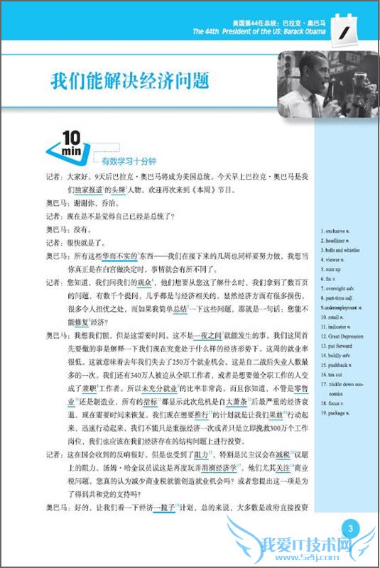 •轻松输入十分钟:在仅有关键词(页面左栏)提示下,尽量不借助其他工具边阅读英文边听音频,了解文章大致主题思想(8分钟左右)。复习单词(2分钟左右)。