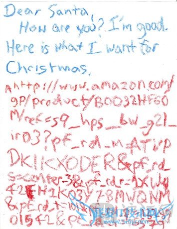 One kid is helping Santa and the elves out by showing them exactly where they can find what he wants this year – and apparently some of it is at Amazon.com.为了给圣诞老人和圣诞小精灵们找礼物提供方便,一个孩子在自己今年的礼物清单上写明了礼物的链接地址——其中一些显然是亚马逊网上的链接。