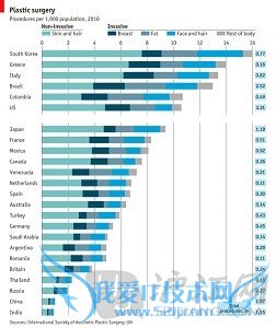 A 2009 survey by Trend Monitor, a market-research firm, suggested that one in five women in Seoul had gone under the knife. Beauty is beheld differently in different countries. There are seven times more buttock operations in Brazil than the top-25 country average. In Greece, penis enlargements are performed ten times more often than the average.根据市场调查公司Trend Monitor 在2009年的统计数据,20%的首尔女性都做过整形手术。不同国家的审美观不同。在巴西,臀部整形的手术数量比前25名的国家平均数还高出了6倍。而在希腊,阴茎增大的手术数量比平均值高出了9倍之多。