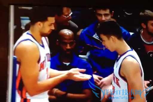 1. Fields and Lin exchange snappy high fives with opposite hands.林书豪和菲尔兹相对站立,很帅气地伸左手击掌。
