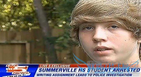 School officials were alarmed by 16-year-old Alex Stone’s words and called police. Now Stone and his mother Karen Gray are speaking out to media as they feel the school overreacted.学校被这个名叫亚历克斯·斯通的16岁学生的作文吓到并报了警。目前,斯通和他的妈妈凯伦·格雷找到媒体澄清,并表示是学校反应过度了。