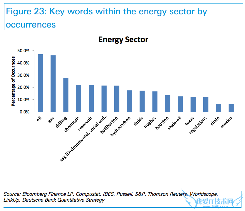The energy sector contains few surprises, with "oil", "gas", and "drilling" coming in as the top three words in Deutsche Bank's list. Location is key for oil jobs, with "Houston", "Texas", and "Mexico" also frequently showing up in energy sector listings.能源界的常见词也基本上不出意料。在德意志银行的排名中,“石油”、“天然气”、“钻井”排名前三。地点是石油类工作的关键,“休斯顿”、“德克萨斯州”、“墨西哥”是能源行业招工广告中的常客。