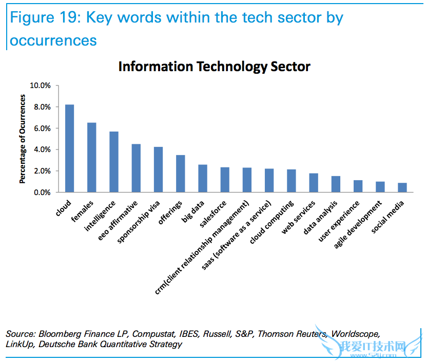 In the tech sector, the authors noted that various industry buzzwords like "cloud", "big data", and "software as a service" are especially common in job postings.作者们指出,在科技界,“云”、“大数据”、“软件即服务”等业界流行词在招聘广告中尤为常见。