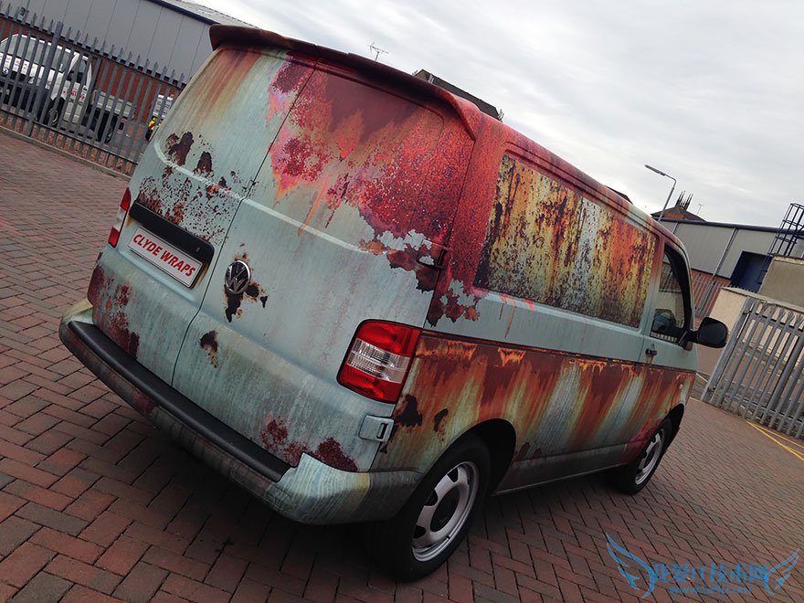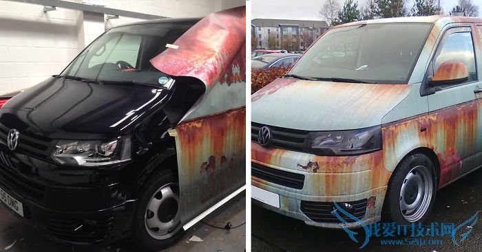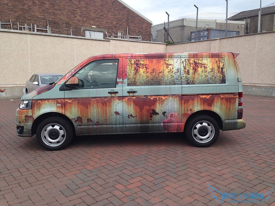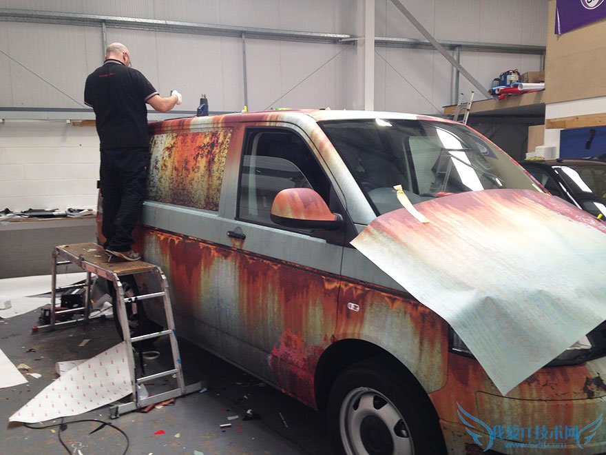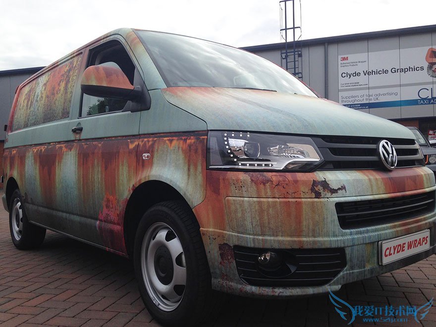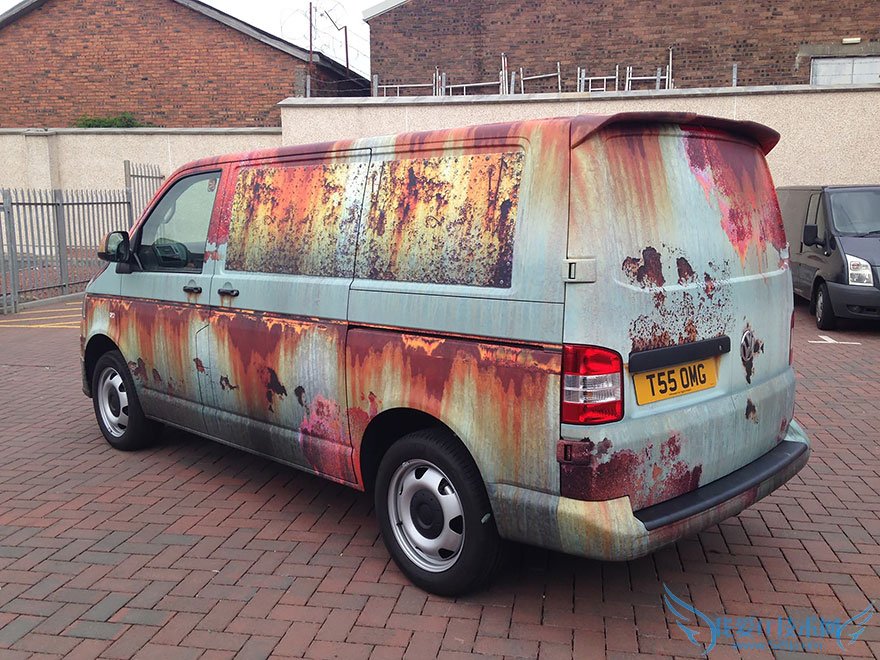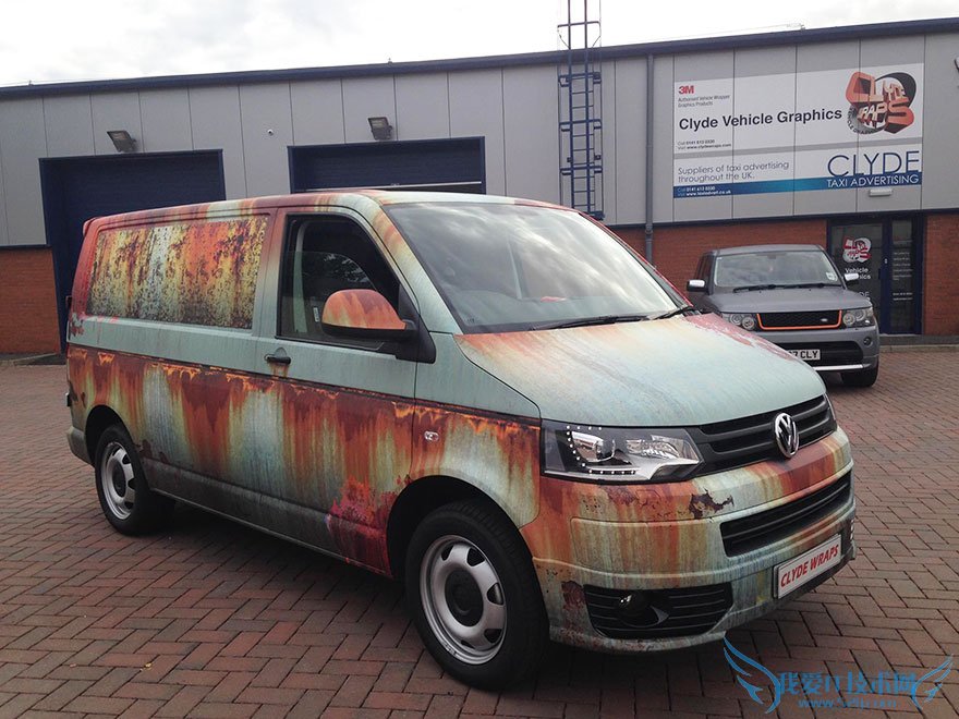 There are plenty of different ways to protect your car from theft, but one owner of a Volkswagen Transporter van decided to protect it in a novel way – by covering the new vehicle in rust-like vinyl to make it look like a hunk of junk!咱都知道要给汽车防盗的方法有很多。但是,一位大众T型车的车主却想到了一个神奇的办法 ——给车身贴上了生锈图案的乙烯膜,让车看起来如同一堆废铁。