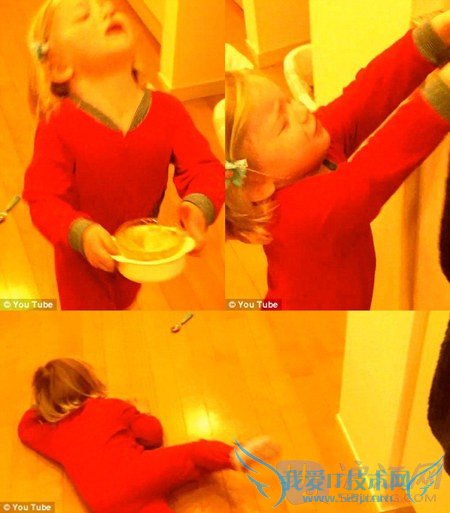 A father recorded his toddler's hilariously over-dramatic attempts to pick up her bowl from the floor, despite her claims that it was 'too heavy' for her to lift.小柯尔斯的爸爸用摄像机记录下了刚学会走路的女儿在把碗放进水槽的过程中所表现出的夸张且精湛的演技,这期间他的女儿还不停地喊着“太重了”。