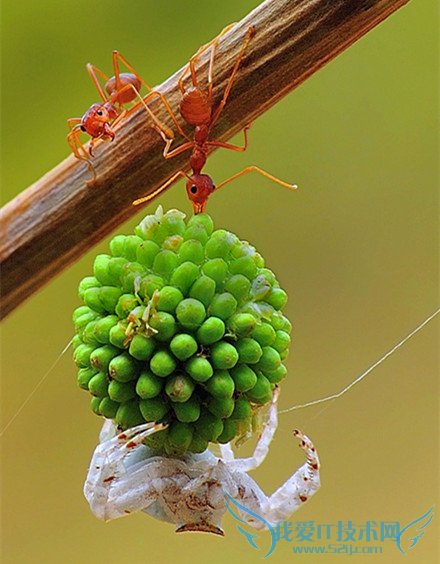 When the ants are confronted by a massive white spider - relatively speaking - they appear to gang up for protection against the arachnid.这些蚂蚁碰上了一只巨型白蜘蛛——相对于蚂蚁来说——他们貌似要联合起来做保护,对付这只蜘蛛。