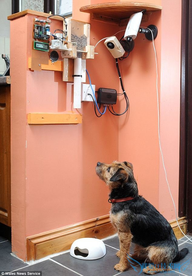 The doggy treat then comes dropping down the tube and into Toby's food bowl. Then a digital camera then takes a photo of him and sends it back to Nat on Twitter - so he knows Toby has been fed.Ò»¿Å¹·Á¸±ý¸ÉËæ¼´Ë³×ŹܵÀÂäÈëÍбȵÄÍëÖС£ÉãÏñ»ú»áͬʱÅÄÏÂÍбȵÄÕÕÆ¬Í¨¹ýÍÆÌØ´«¸øÄÉÌØ£¬ÕâÑùÄÉÌØ¾Í»áÖªµÀÍбÈÊÇ·ñ½øÊ³ÁË¡£