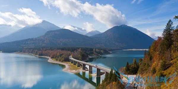 See the fiery-hued mountains reflected in Lake Sylvenstein in Bavaria, Germany, as you drive over the Sylvenstein Dam.在德国巴伐利亚,当你驱车行驶在Sylvenstein大坝上,你会看到湖面上倒映着的绯色山景。