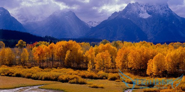 The sun's rays illuminate an aspen grove at Oxbow Bend in the Grand Teton National Park in Wyoming, with storm clouds over the Tetons.在怀俄明州的大蒂顿国家公园,阳光穿透乌云,照射在Oxbend Bowd的杨树丛上。