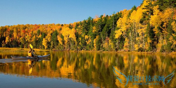 Kayak along the Bonshaw River on Prince Edward Island in Canada, meanwhile, and there's a prize of golden leaves reflecting in shining waters.在加拿大的爱德华王子岛,沿着邦肖河划着独木舟,一时间,金色叶子的影子映射在光亮的水面上。