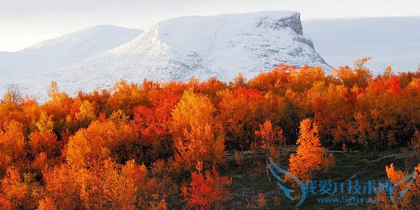 The intensely red autumnal trees in Sweden’s Abisko National Park contrast starkly with the snowcapped mountains rising above them.在瑞典阿比斯库国家公园,分外显眼的红色秋木与高起的雪山形成鲜明对比。