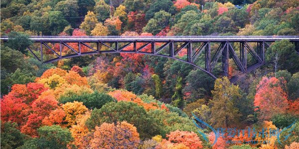 A kaleidoscope of colours surrounds a bridge in Bear Mountain in New York during an autumn season.秋季时分,纽约大熊山间的一座桥被秋色环绕,色彩斑斓,变化万千。