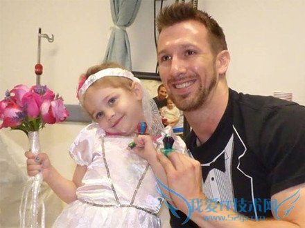 A child battling cancer "married" her favorite nurse in a simple ceremony held at the Albany Medical Center (AMC) in New York, where she usually goes for treatment. The event was complete with flowers, cake and a toy car that has a "just married" sign.纽约的阿尔伯尼医疗中心,一名患癌女童经常来这里接受治疗。在这里她“嫁”给了自己最心仪的男护士,并举行了一场简单的婚礼。婚礼当天,鲜花有了,蛋糕有了,甚至还有一辆玩具婚车,上面还标了“新婚”字样。
