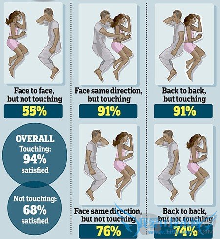 Revealing: Couples who sleep less than an inch apart are happier than those that have a wider gap between them when they sleep. Of those who do not touch, the largest number of happy couples face the same direction – above those who sleep back to back or facing each other.揭示:睡觉时相隔少于1英寸(2.54厘米)的情侣比那些间距大的情侣更幸福。而对于那些睡觉时没有身体接触的情侣来说,大部分感情良好的人睡觉时面朝同一个方向,背对背或面对面的情侣感情欠佳。