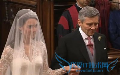 Kate is now walking up the aisle with her father Michael Middleton. Her veil is over her face and concealing her tiara. The dress is Sarah Burton of Alexander McQueen. 凯特现在由父亲陪同走上红毯,戴着面纱和皇冠,婚纱设计者是Sarah Burton。
