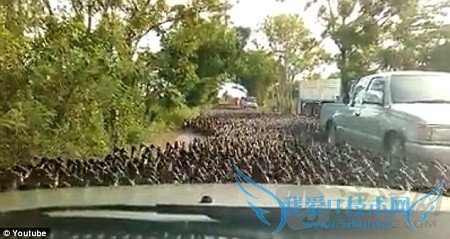 Thai motorists were left stunned after thousands of ducks suddenly flooded a country road.泰国的一条乡村公路上突然挤满了成千上万只鸭子,摩托车手们都被吓呆了。