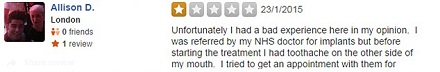 She then received another letter demanding this note be removed too. ‘In return they offered to refund £185 of the initial £384 fee I paid as long as I agree never to mention B Dental again. But I felt bullied and couldn’t agree never to speak about them again.’然后她又收到一封信,称那条附注也要删掉。艾莉森说:“他们说只要我同意不再对诊所做出任何评论,就会退还给我185英镑,而我最开始付的医疗费用是384英镑。我觉得我受到到了欺负,所以无法同意不再对他们做任何评论的要求。”