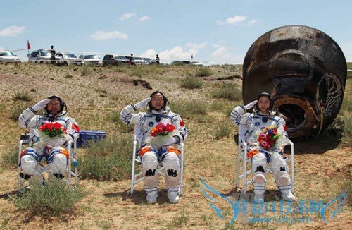 The return capsule of Shenzhou IX spacecraft touched down in north China's Inner Mongolia Autonomous Region as planned. Medical staff entered the capsule and reported the astronauts were in good conditions.神舟九号的返回舱已按照预定的计划顺利着陆于内蒙古自治区。医疗队人员进入返回舱中,报告三名宇航员身体状况良好。