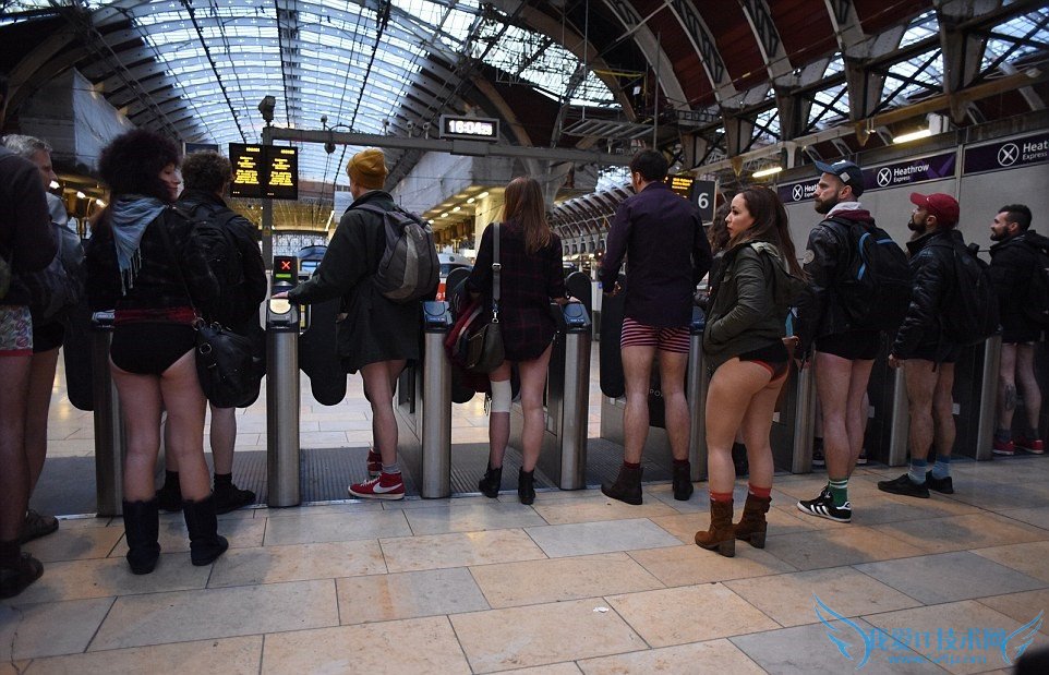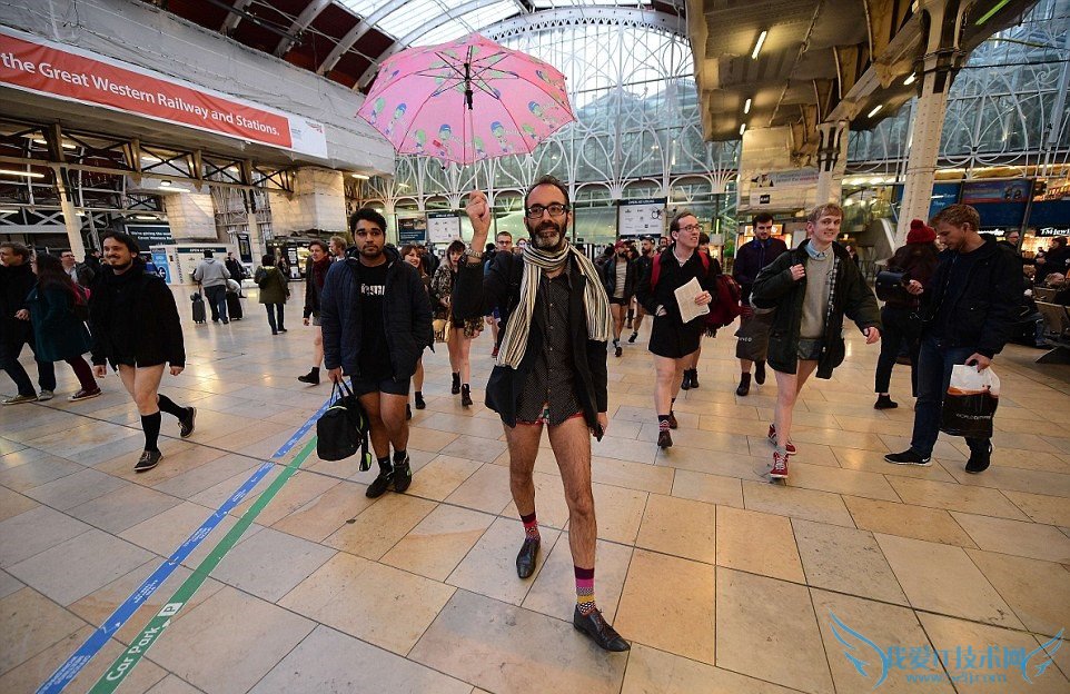 'No Pants' participants walk trouserless through Paddington station on Sunday as the 'No Pants Subway Ride' kicked off across the globe.星期天,“地铁无裤”活动在全球展开,“无裤”参与者脱掉了裤子,穿过英国帕丁顿地铁站。