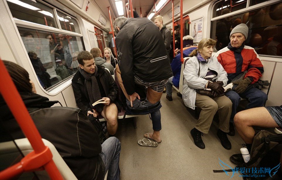 Joining in the fun: This man removes his trousers in order to take part in the Czech Republic's 'No Pants Subway Ride' in Prague.一起嗨:在捷克布拉格,这名男子当场脱掉裤子,加入到的“无裤地铁”活动中。