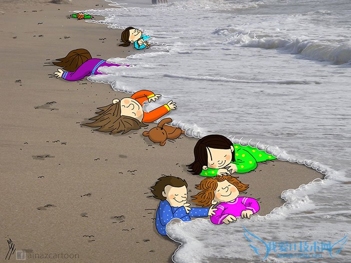 On Wednesday morning (Sept. 2), Turkish police found the body of a 3-year-old Syrian refugee – Aylan Kurdi – who had drowned together with his 5-year-old brother Ghalib and mother Rehan in the Mediterranean sea while trying to escape Syria. Images of his lifeless body went viral, driving home the danger and desperation of the refugee crisis in Syria and inspiring a powerful emotional response from artists around the world.周三早晨(9月2日),土耳其警方发现了年仅3岁的叙利亚难民艾兰·库尔迪的尸体。这个小男孩和自己5岁的哥哥加里卜还有母亲里恩逃离叙利亚之时淹死于地中海。幼小尸体的图片如同病毒般蔓延开来,它让人深刻理解了叙利亚难民危机的危险和绝望境地,并且激起了全世界艺术家强烈的情感反响。