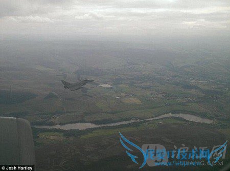 Shadowed by an RAF Typhoon jet bristling with weaponry, this is the moment terror was brought to Britain’s skies when an airline passenger claimed there was a bomb on the plane.皇家空军一架全副武装的台风式战斗机紧紧跟随一架客机。乘客声称机上有一枚炸弹,引起了恐慌。