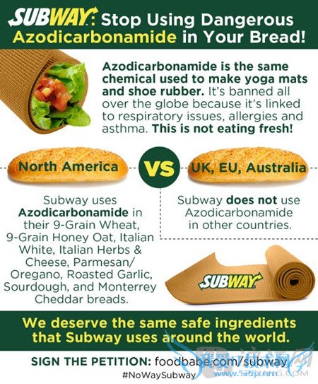 But representatives for Subway, which apparently does not use the chemical in its European or Australian markets, would not say when the company would actually effect the changes.赛百味并未在欧洲及澳洲市场上使用偶氮二甲酰胺,但赛百味发言人并不愿透露该项变动何时能够生效。