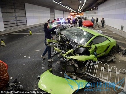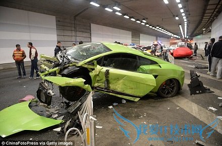 The spectacular crash on Saturday wrote a green Lamborghini off and wrecked a red Ferrari.该起交通事鼓发生在上周六,两人驾驶的汽车分别是一辆绿色的兰博基尼和一辆红色的法拉利。