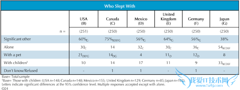 Over half of respondents in Japan reported sleeping alone, while three-quarters of respondents in Canada reported sleeping with a significant other.超过半数的日本人表示他们喜欢独自睡觉,同时四分之三的加拿大人表示他们会喜欢和另一半一起睡。