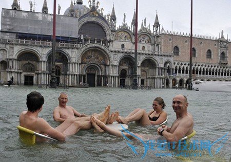 One group soaked up their surroundings as they sat submerged up to their waists at a café in St Mark’s Square while another daring couple decided to go for a quick swim. 一群人坐在圣马克广场的一家咖啡馆里,他们完全是泡在水里,水漫到腰部;而另一对大胆的夫妇决定快快游个泳。