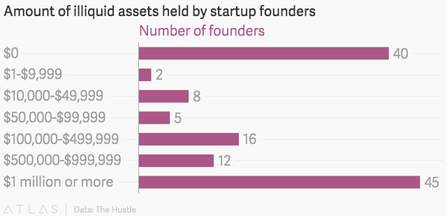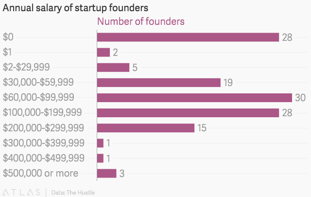 And what do startup founders actually pay themselves? Following the lead of many CEOs whose salaries are entirely based on performance, 28 startup founders say they take zero salary, and two earn $1 annually. (This, of course, leaves out stock-based compensation; see next chart.) But most founders make less than six figures, probably less than the engineers working for them.那么企业创始人到底怎么赚钱的呢?跟随工资完全取决于他们表现的首席执行官的带领,28位企业创始人说他们没有工资,另外2位说自己年收入为1美元。(这当然不算股权收入;详情看下一张图表。)但是大多数企业家赚的钱少于六位数,也许比为他们工作的工程师还少。
