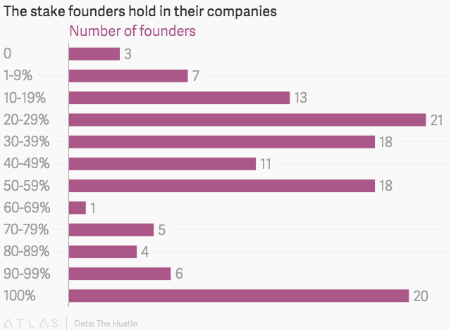 Three founders say they own none of their company—these founders all have salaries between $100,000 and $200,000. In contrast, 40 retain 100% ownership, but most have between 20% and 39%.三位企业家说他们并没有“拥有”自己的公司——这些企业家都有10万美元到20万美元之间的工资。与此相反的是,40位企业家100%拥有自己的公司的股权,但是大多数只拥有20%到39%的股权。