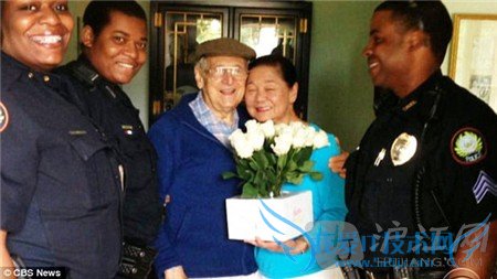 A frantic Doris Amrine was relieved when she saw her husband of 60 years walking up their front stairs in the company of the police officers, but her relief turned to joy when he presented her with the carefully selected bouquet.和妻子结婚已有60年的丈夫在警察的陪同下出现在家中的前楼梯,惊慌的妻子多莉丝·爱莫林看到丈夫终于松了一口气,随即在看到精心挑选的花束之后、多莉丝欣喜若狂。