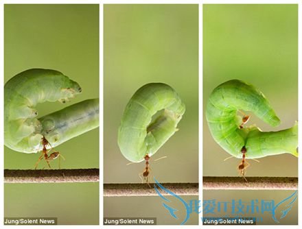As the caterpillar begins curling up to protect itself, the weaver ant keeps a firm grip while a fellow worker ant climbs onto it.µ±Ã«Ã«³æÊÔͼòéËõÆðÀ´ÒÔ±£»¤×Ô¼ºÊ±£¬±àÖ¯ÒϽô½ôµØÒ§×¡²»·Å£¬¾ÍÔÚ´ËʱËüµÄͬ°é¹¤ÒÏÅÀµ½ÁËëë³æµÄÉíÉÏ¡£