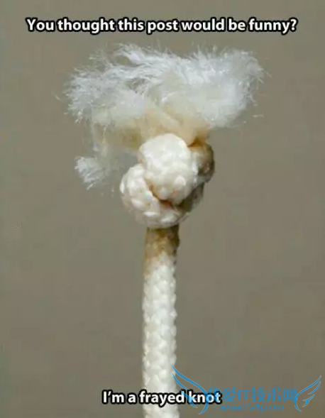笑点解析:I'm a frayed knot.(我是一只磨损的绳结。)和I'm afraid not.(我不这么认为)两句话听上去完全相同,所以这段话在字音上也可以理解为“你以为这个帖子会很搞笑?——我不这么认为。”