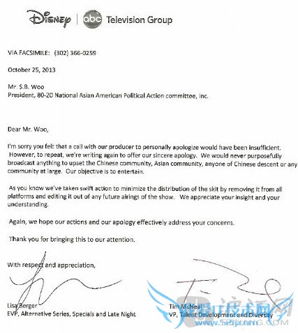 It was signed by Lisa Berger, an ABC executive vice president who oversees the Jimmy Kimmel Live show, and Tim McNeal, vice president of ABC’s talent development and diversity branch. 这封道歉信由ABC广播公司负责监管该节目的副总裁丽莎·柏格和人才开发和多样化部门的副总裁麦克·尼尔联名签署。