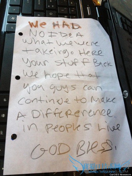 We had no idea what we were takeing [sic]. Here your stuff back. We hope that you guys can continue to make a difference in peoples [sic] live. God bless.“我们之前真不该拿这些东西,现在都还给你。希望你们能继续帮助人们好好生活。上帝保佑你们。”
