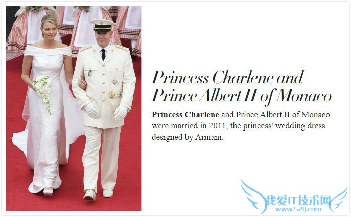 王妃夏琳和摩纳哥王子阿尔伯特二世亲王:夏琳王妃和摩纳哥王子阿尔伯特二世于2011年结婚,王妃当时穿的是阿玛尼的婚纱设计。