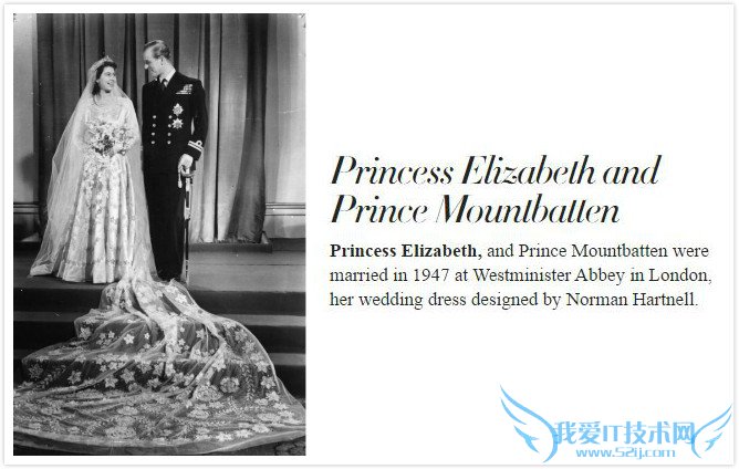 伊丽莎白女王和菲利普亲王:伊丽莎白女王与菲利普亲王于1947年在伦敦威斯敏斯特教堂结婚,其婚纱是由诺曼·哈特奈尔设计。