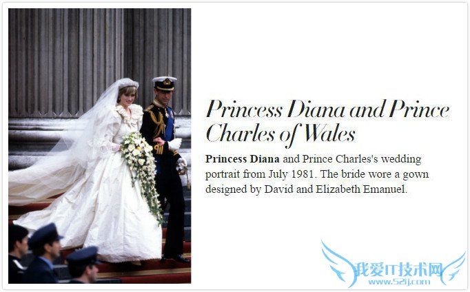 戴安娜王妃和威尔士查尔斯王子:这是戴安娜王妃和查尔斯王子于1981年7月份拍摄的结婚照。新娘当时穿的礼服是出自由伊曼纽尔夫妇之手。