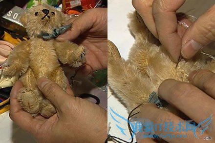 李先生说着拿出了一个小泰迪熊(见上图),在熊的背上缝起针来。他使用一种名为“皮革缝补”的方法,他说,那就像系鞋带一样简单。