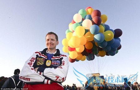 Trappe was using the event as a warm-up for his planned trans-Atlantic flight scheduled for next summer. He aims to complete the 2,500 mile journey across the pond in a seven foot lifeboat carried by 365 huge helium balloons.特拉普参加这次的活动权当是热身,因为明年夏天他计划飞跃大西洋。他的目标是完成2500英里横跨大西洋的旅行,他的飞屋由一艘6英尺长的救生艇和365个巨大的氦气球组成。