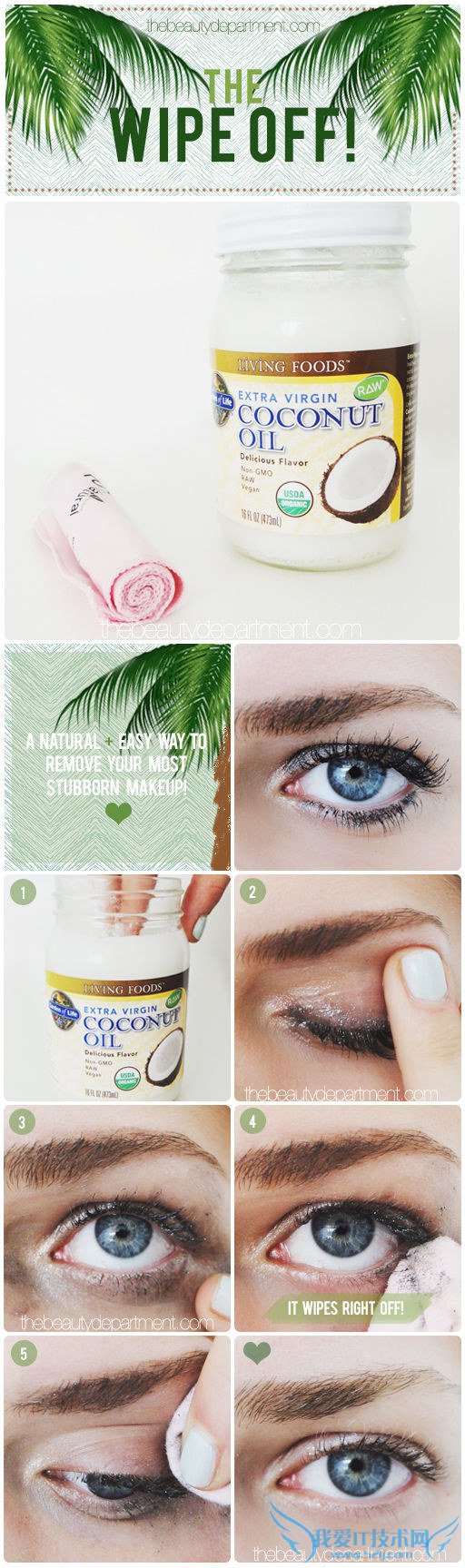 20. If you don't have makeup remover, just use coconut oil.如果没有卸妆水了,用椰子油卸妆效果也很好。