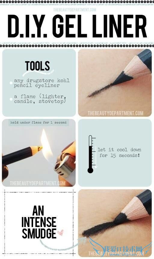 22. If you want a smudgy eyeliner look but only have a regular kohl pencil, heat up your pencil over a stove burner for a few seconds to soften it.如果你想要眼线达到烟熏的效果但只有普通的眼线笔,就用打火机把眼线笔烧几秒钟软化一下再用。
