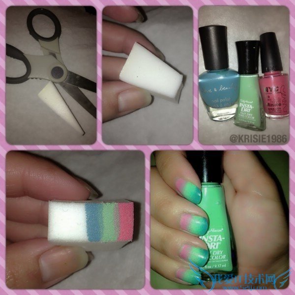 25. Ombre nails take a lot of work. Or not! Use this simple sponge method to apply several colors of polish at once! No waiting for several shades to dry before your nails are done.凤尾指甲做起来很麻烦。非也!用海绵涂指甲油法,就可以一次同时涂几个颜色了!这样就不用一层一层地涂指甲油再等着慢慢变干了。