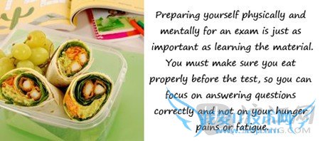 1 Eat a well-balanced meal before the actual exam. If your exam is in the morning, give yourself time to eat breakfast. Include protein and fruit to provide energy. 在考试之前要平衡膳食。如果你是早晨考试,一定要吃早餐。包括蛋白质和水果,可以为你提供能量。